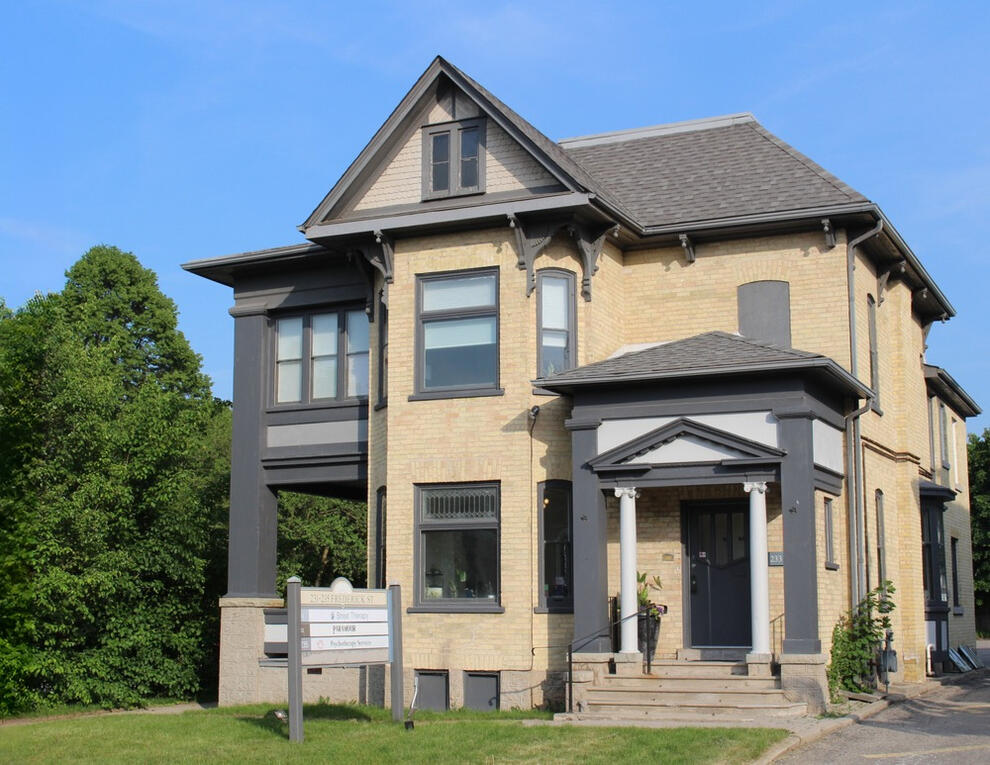 The office is in a converted house with multiple entrances. Free parking is available at the back of the building. From the parking lot, use the entrance on the right side of the building. If arriving on foot, the front entrance is on the left.